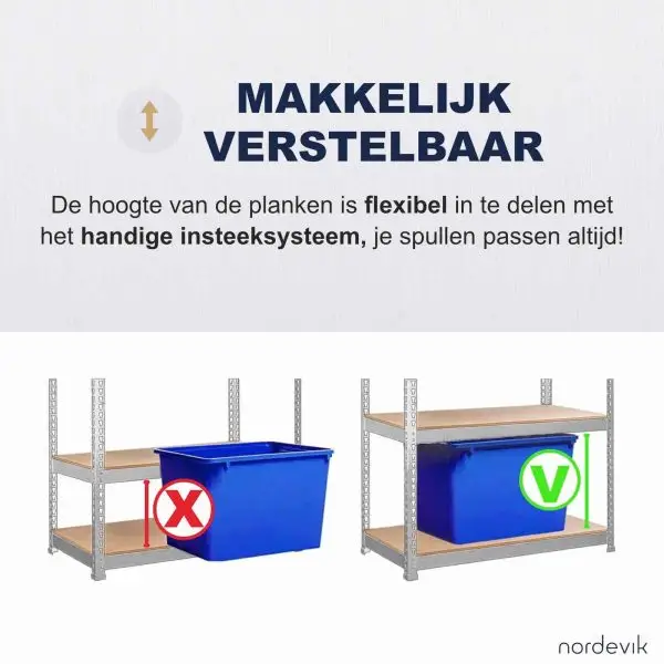 - In hoogte verstelbare planken: De stellingkast is eenvoudig in hoogte te verstellen waardoor er plek is voor zowel grote als kleine spullen.